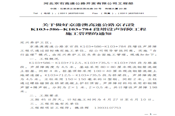 關(guān)于做好京港澳高速公路京石段K103 586_K103 784段增設聲屏障工程施工管理的通知
