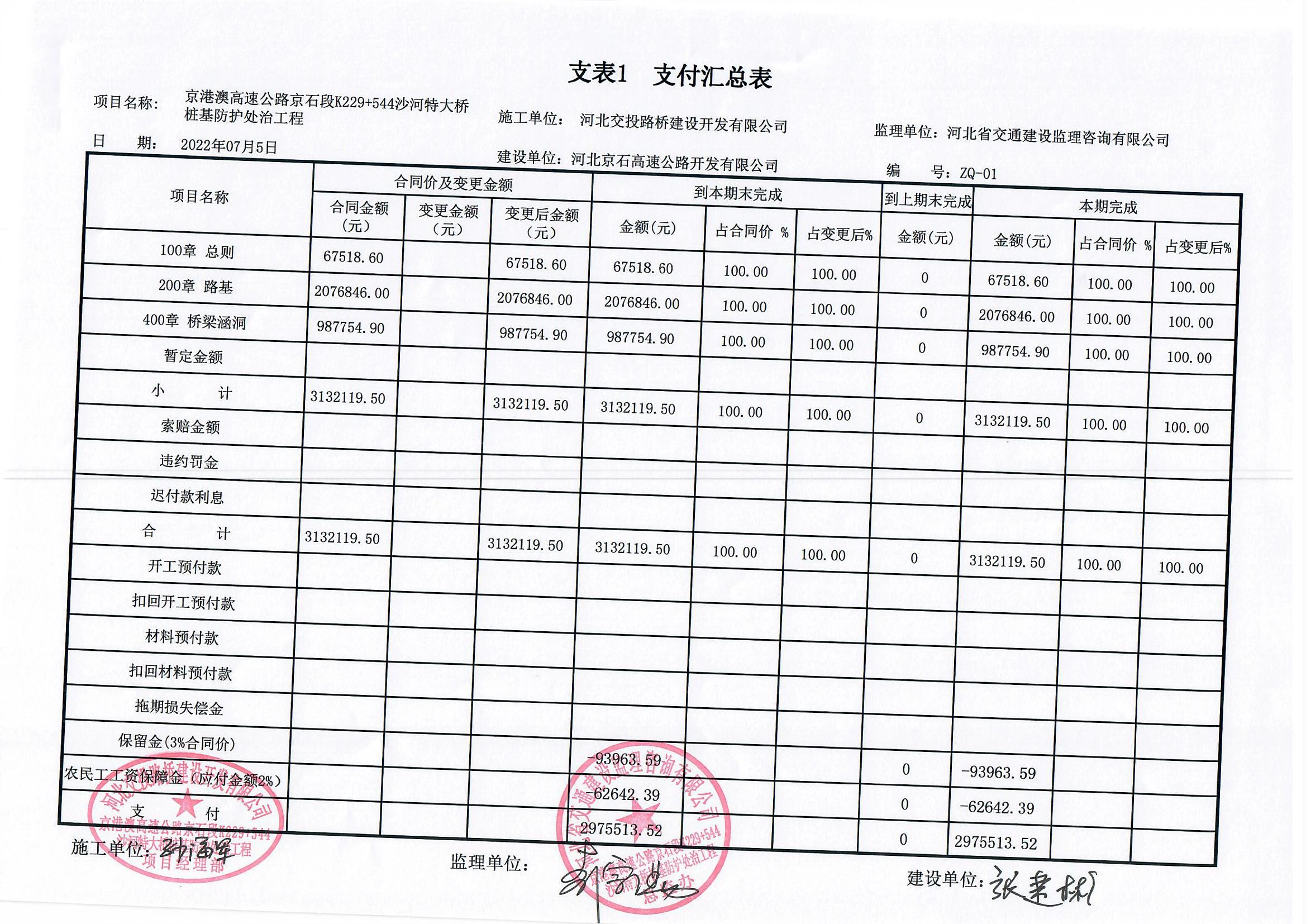 京港澳高速京石段沙河特大橋樁基防護(hù)處治工程支付證書(shū)應(yīng)