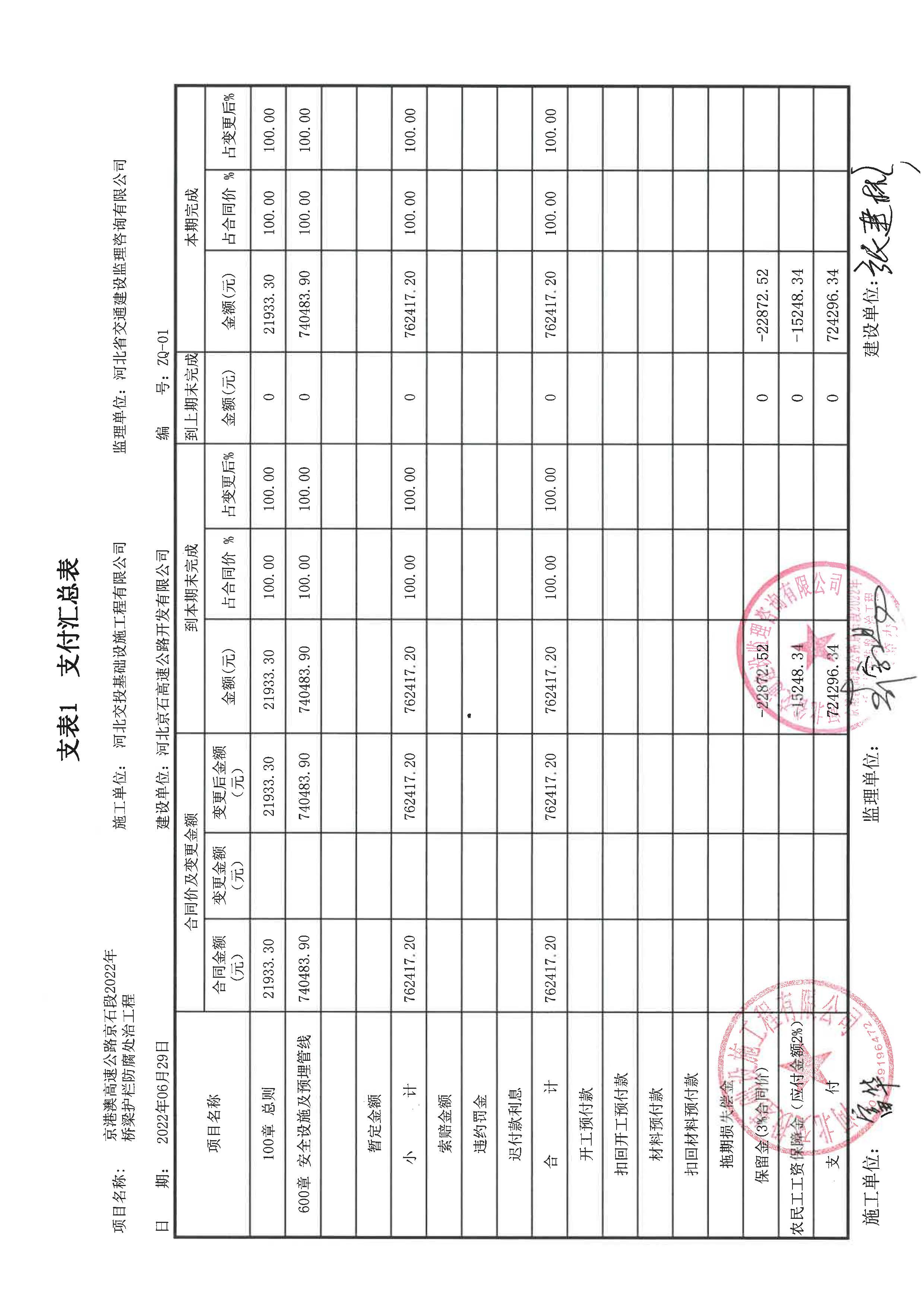 2022年橋梁護欄防腐處治工程支付證書