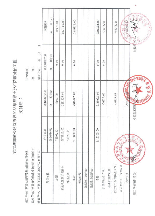 京港澳高速公路京石段2023年混凝土護欄防腐處治工程支付證書