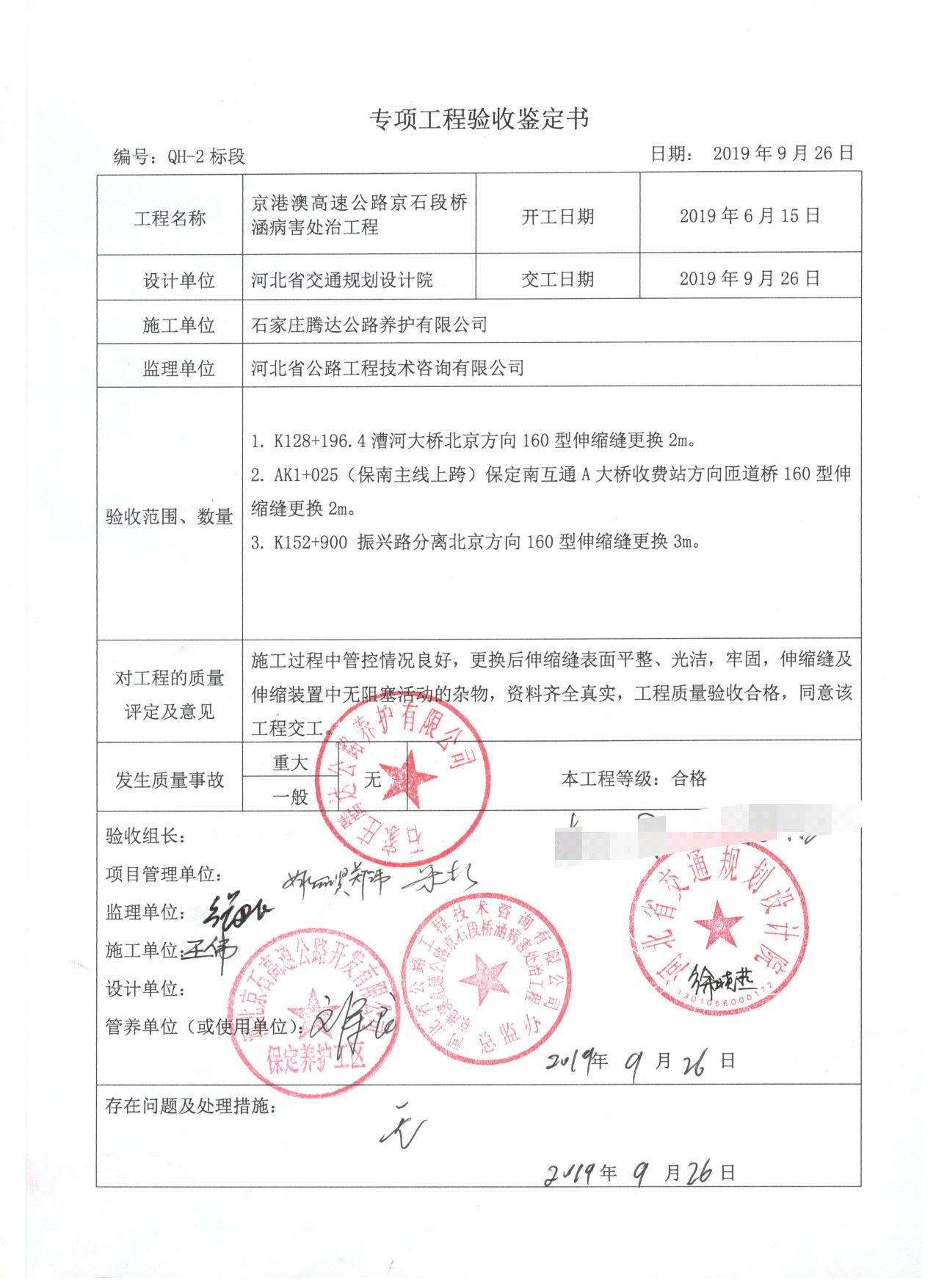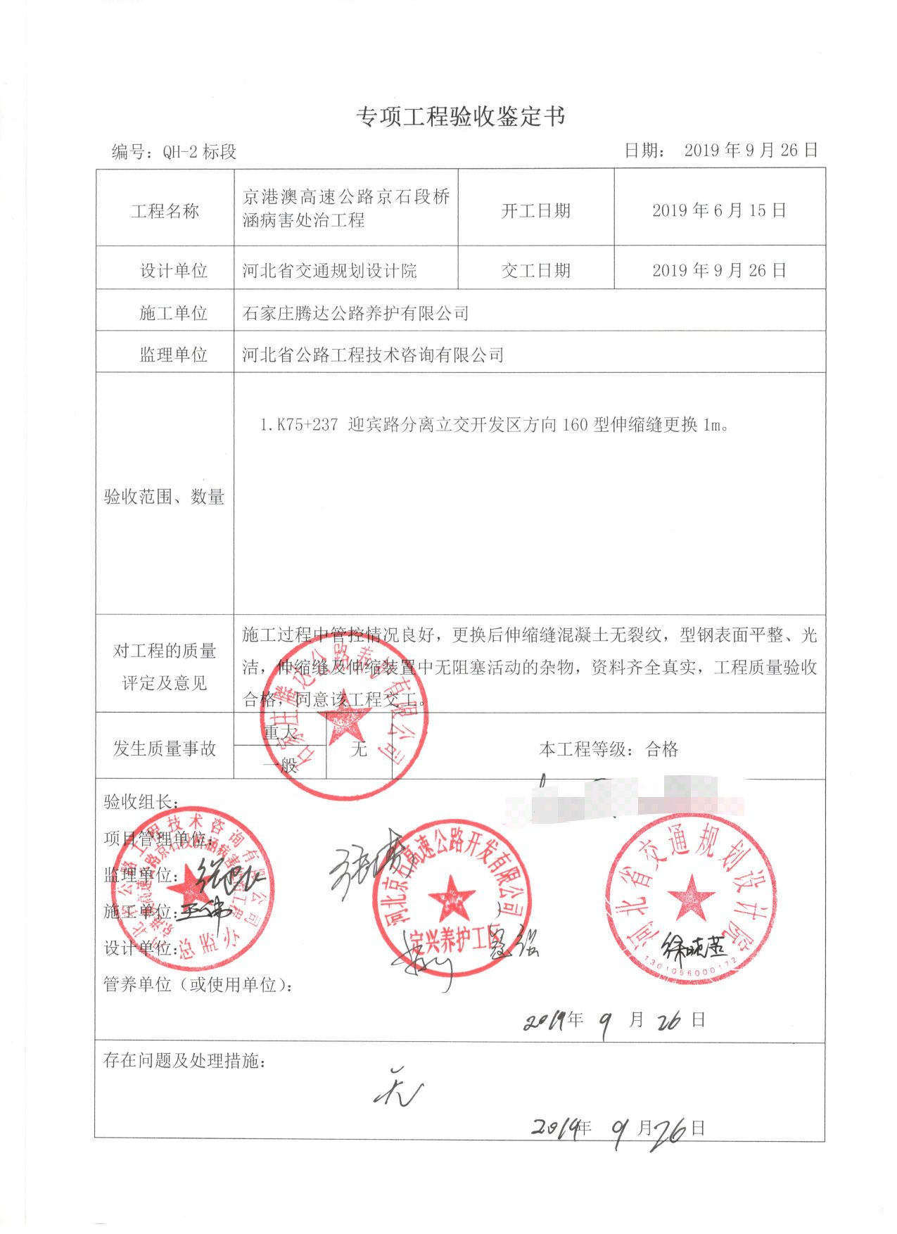 京港澳高速公路京石段橋涵病害處治工程QH-2標(biāo)段工程專項鑒定書