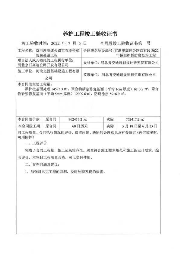 京港澳高速公路京石段2022年橋梁護(hù)欄防腐處治工程驗(yàn)收證書(shū)