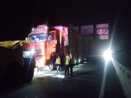 經(jīng)詢問司機(jī)得知,貨車右前輪突然掉落,導(dǎo)致車輛無法移動。事發(fā)突然,且處于夜間,大風(fēng)呼嘯,情況十分危險(xiǎn)。定州工區(qū)工作人員立即反應(yīng),第一時間在貨車后方規(guī)范設(shè)置交通警示標(biāo)志,巡查車開啟導(dǎo)向標(biāo)、高音警報(bào)器,避免過往車輛發(fā)生碰撞事故,引導(dǎo)車上人員轉(zhuǎn)移至護(hù)欄外安全地帶。同時,迅速撥打高速交警與救援電話,通報(bào)現(xiàn)場情況。智調(diào)中心及時利用可變情報(bào)板對后方來車予以提醒,避免造成事故。