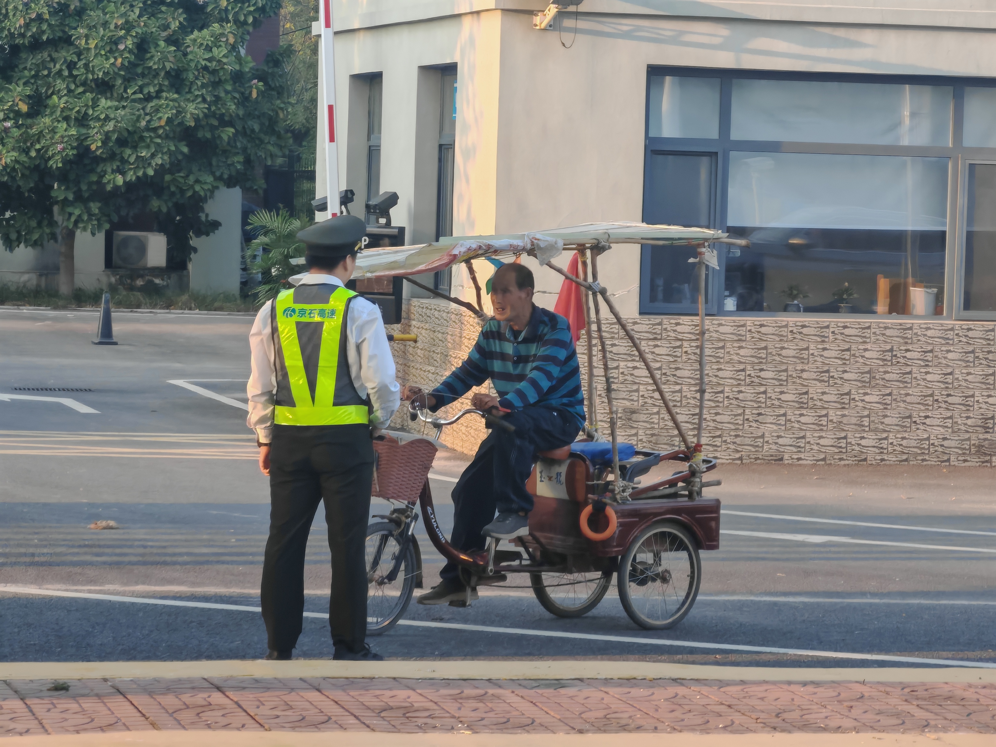國慶假期,健康城收費站車流如織。工作人員突然發(fā)現(xiàn),一位老人正騎著三輪車,試圖駛?cè)胧召M站入口車道,身旁車輛呼嘯而過,險象環(huán)生。