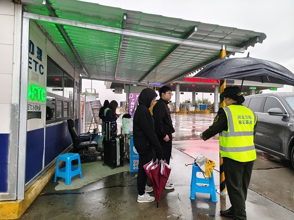 返程大軍中,一群正在等候返校大巴的學(xué)生格外引人注目。由于班車尚未抵達(dá),他們只能在雨中焦急等待,衣衫漸漸被雨水打濕。收費(fèi)站工作人員發(fā)現(xiàn)后,立即上前招呼:"同學(xué)們,先到這邊來避避雨!"學(xué)生們被引導(dǎo)至"愛心驛站"的遮雨棚下,這個(gè)臨時(shí)的避風(fēng)港,不僅為學(xué)子們擋住了風(fēng)雨,更讓他們?cè)诼L的返校路上,收獲了一份意外的溫暖。