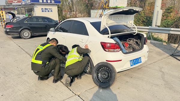 11月4日,京石高速定興收費(fèi)站口,一輛白色轎車(chē)駛出收費(fèi)車(chē)道時(shí),左后輪胎已然癟氣。值班工作人員第一時(shí)間示意司機(jī)停靠安全位置,并迅速展開(kāi)檢查。