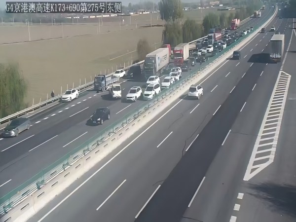 11月15日11時25分,智慧調(diào)度中心監(jiān)控人員通過視頻巡檢發(fā)現(xiàn),京石高速南行K173處發(fā)生兩輛貨車追尾事故,占據(jù)兩條車道,導致后方車流積壓,現(xiàn)場通行緩慢且風險加劇。