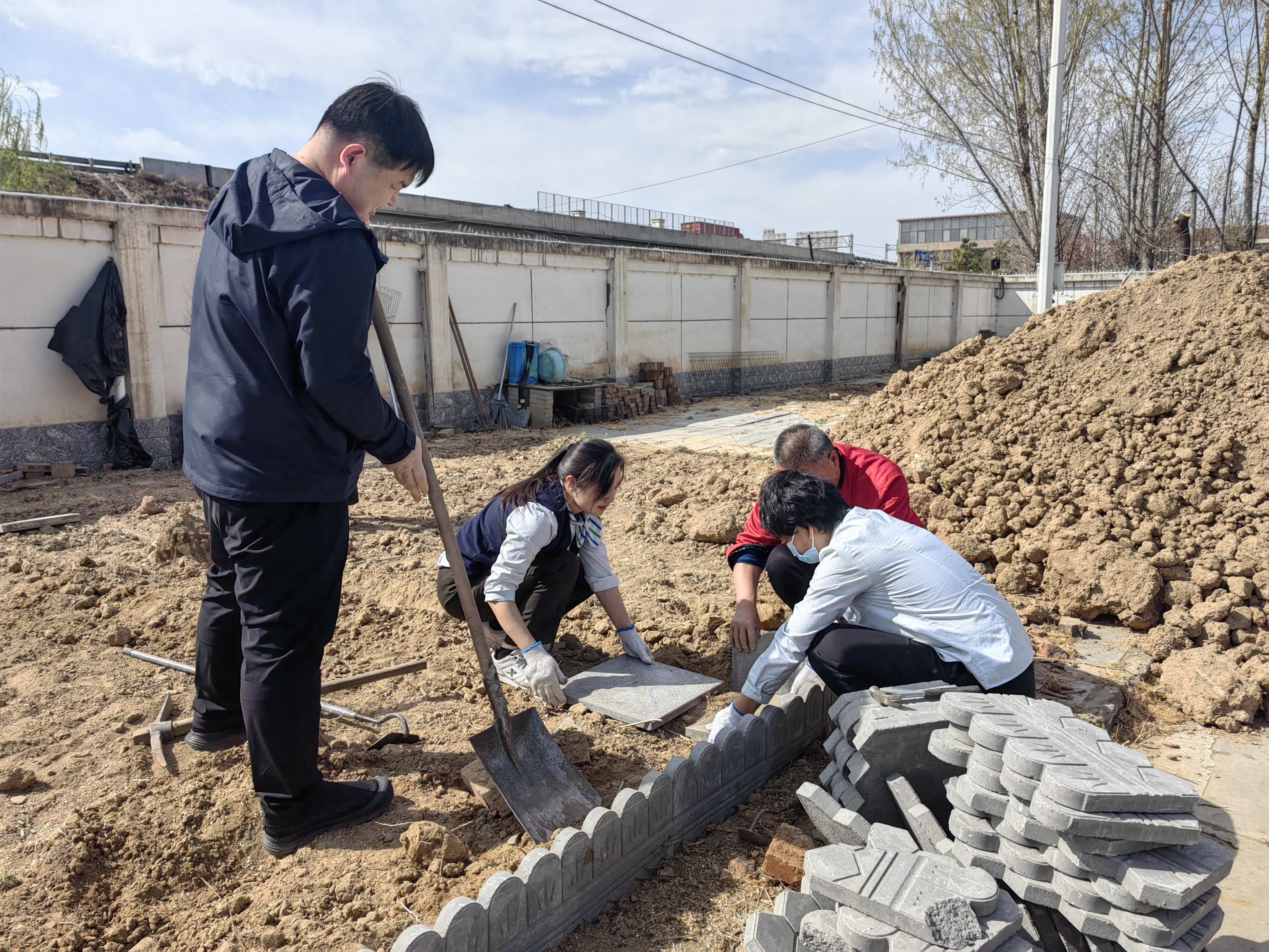 在鋪磚環(huán)節(jié),大家集思廣益,雖然不是專業(yè)的,但是在這個網(wǎng)絡(luò)發(fā)達的時代,大家對照手機里的教學視頻,將每塊磚錯縫排列,既能防止雜草滋生,又形成自然的導(dǎo)水槽。站長劉淑芳帶著“徒弟們”用棉線拉出筆直的基準線,食堂“資深”的蘇師傅手持橡膠錘反復(fù)敲打校正,磚縫誤差嚴格控制在3毫米內(nèi)。新入職的昕瑤邊鋪磚邊贊嘆:“這手藝太牛了。”引得眾人哈哈大笑。大家干得熱火朝天,汗水浸透了衣服,也不知疲倦,仿佛閃念間看到了不久后菜園里豐收的場景。