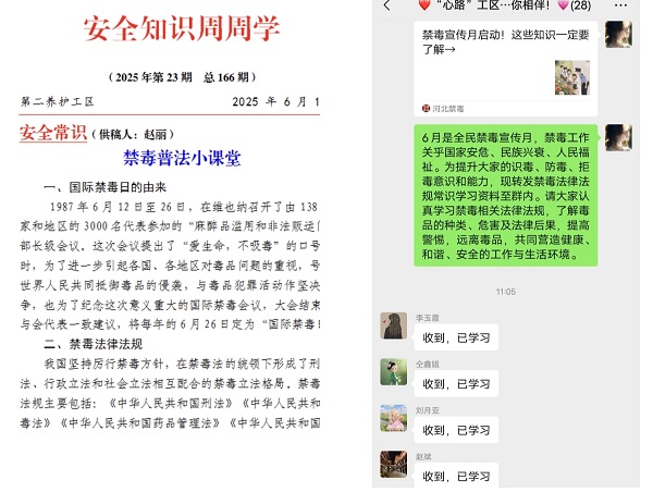 創(chuàng)新載體促長效,拓寬線上宣傳陣地。充分發(fā)揮新媒體傳播優(yōu)勢,依托微信工作群推送禁毒知識小貼士,通過圖文并茂的形式解讀禁毒法律法規(guī)、新型毒品種類及涉毒法律后果;在“安全知識周周學(xué)”??虚_設(shè)禁毒專題板塊,開展禁毒普法小課堂,引導(dǎo)職工和公眾系統(tǒng)學(xué)習(xí)禁毒知識。通過持續(xù)推送線上宣傳內(nèi)容,實(shí)現(xiàn)禁毒知識“指尖學(xué)習(xí)”,推動(dòng)禁毒宣傳教育常態(tài)化、長效化。