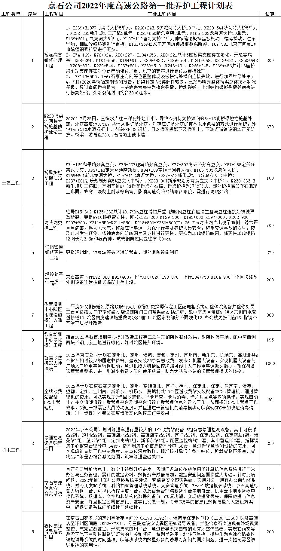 2022年第一批養(yǎng)護工程計劃