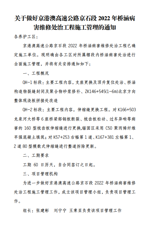 關(guān)于做好京港澳高速公路京石段2022年橋涵病害維修處治工程施工管理的通知