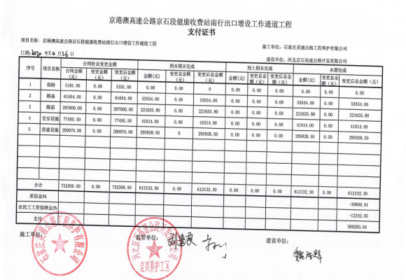京港澳高速公路京石段健康城收費(fèi)站南行出口增設(shè)工作通道工程支付證書(shū)