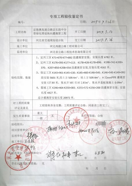 京港澳高速公路京石段中分帶綠化增設(shè)縱向灌溉管工程專項(xiàng)鑒定書