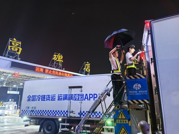 每一輛綠通車,他們都用心去檢查,不放過任何一個(gè)細(xì)節(jié),核車牌、查單據(jù)、驗(yàn)貨物、錄信息,每一個(gè)動(dòng)作都熟練且嚴(yán)謹(jǐn)。雨水順著他們的臉頰滑落,浸濕了他們的制服,但他們的眼神依舊專注。