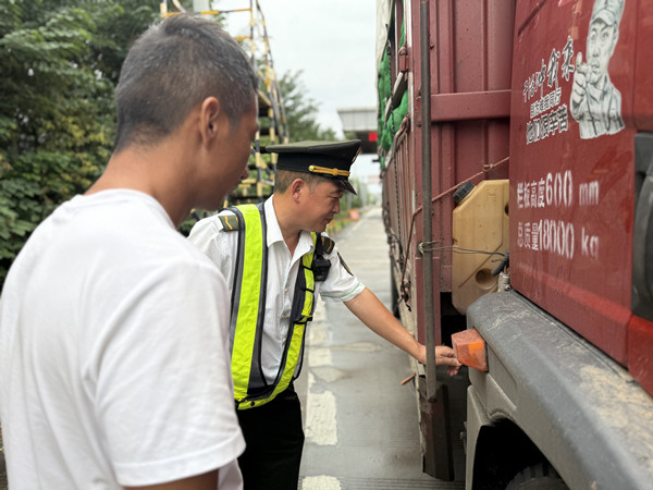 當班工作人員發(fā)現(xiàn)異常后,第一時間上前詢問情況并提供幫助,工作人員一邊協(xié)助司機在車輛后方安全距離處擺放警示錐,提醒過往車輛減速避讓,一邊安排工作人員進行疏導(dǎo),避免發(fā)生事故。